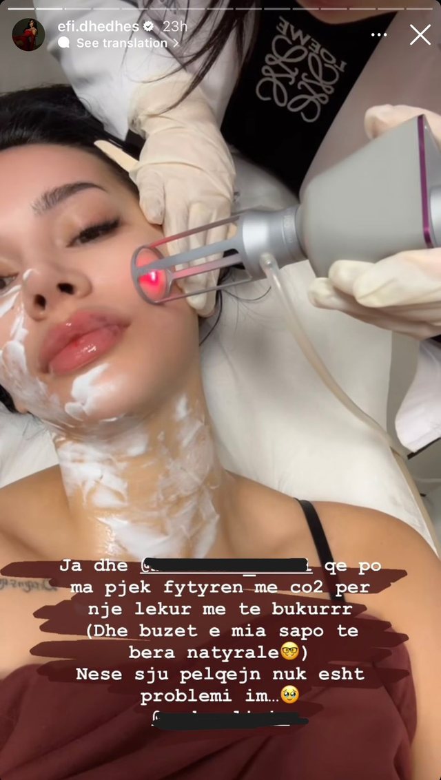Ajo gjithashtu nuk e ka mohuar asnjëherë faktin se ka kryer ndërhyrje estetike në fytyrë, e kështu ka bërë edhe sot. Efi ka treguar përmes një fotoje momentin kur po bënte një trajtim fytyre dhe gjeti rastin të tregonte edhe se ka mbushur buzët me acid hialuronik.