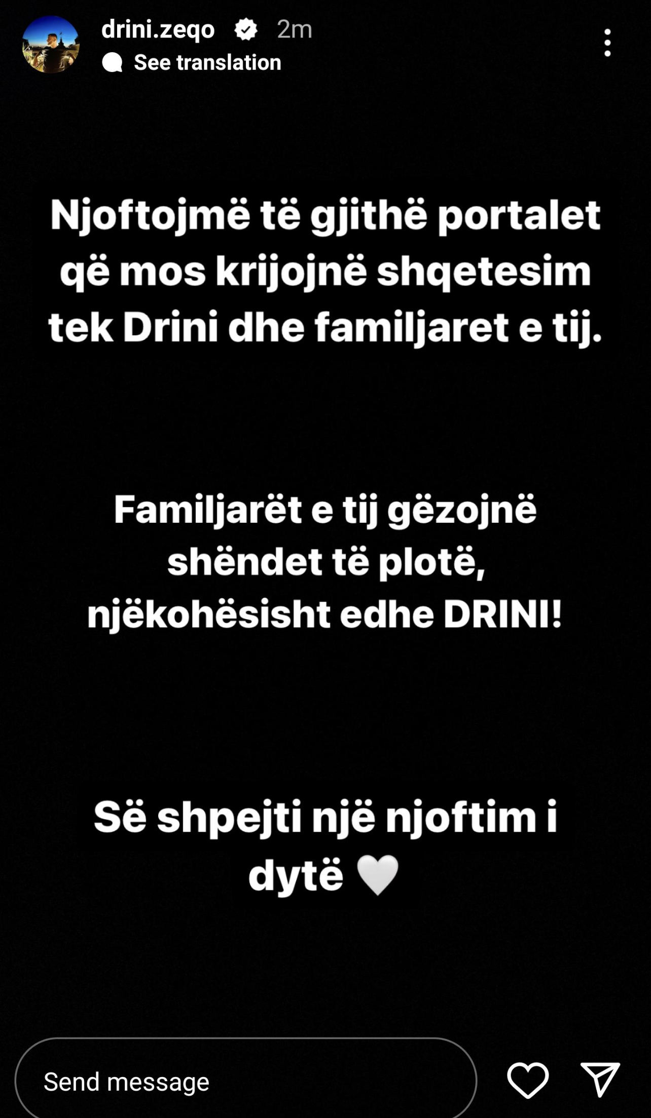 Pas daljes së tij nga shtëpia, në llogarinë e Drinit në Instagram, familjarët e tij kanë dhënë një mesazh, ku tregojnë se si Drini dhe familjarët e tij gëzojnë shëndet të plotë.