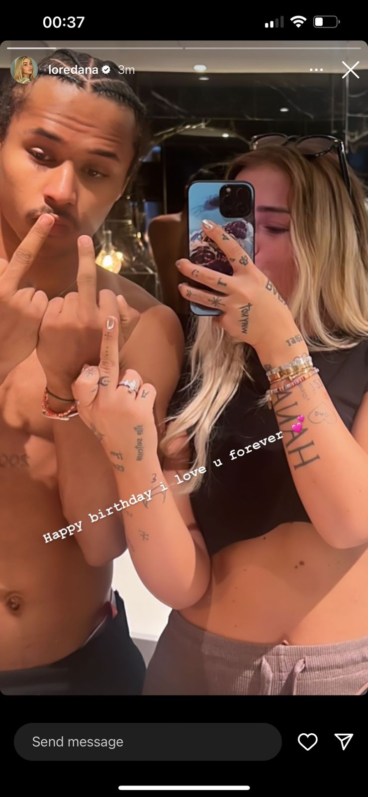 I dashuri i Loredanës, futbollisti gjerman Karim Adeyemi feston sot 21-vjetorin. Loredana ka zgjedhur një mënyrë krejt të pazakontë për ta uruar atë. Këngëtarja shqiptare ka postuar në Instastory një foto ku dyshja kanë qenë duke pozuar para një pasqyre me gishtat e mesit të ngritur. Në foto ajo shkruan: