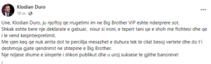 “Unë, Klodian Duro, ju njoftoj që rrugëtimi im në Big Brother VIP është ndërprerë sot. Shkak është bërë një deklaratë e gabuar, nisur si ironi, e tepërt tani qe e shoh me ftohtësi dhe që i lë vend keqinterpretimit. Më vjen keq që nuk arrita dot të përcillja mesazhet e duhura tek të cilat besoj vërtetë dhe do t’i dëshmoja gjatë qëndrimit në shtëpinë e Big Brother. Një ndjesë shumë e sinqertë i shkon publikut dhe i uroj suksese të gjithë banorëve!”, shkruan Klodian Duro në “Facebook”.