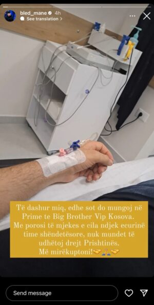 Ndërkohë ditën e sotme ai ka postuar një foto i shtruar në spital duke lajmëruar që edhe mbrëmjen e sotme nuk mund të marrë pjesë në “BBVK”: