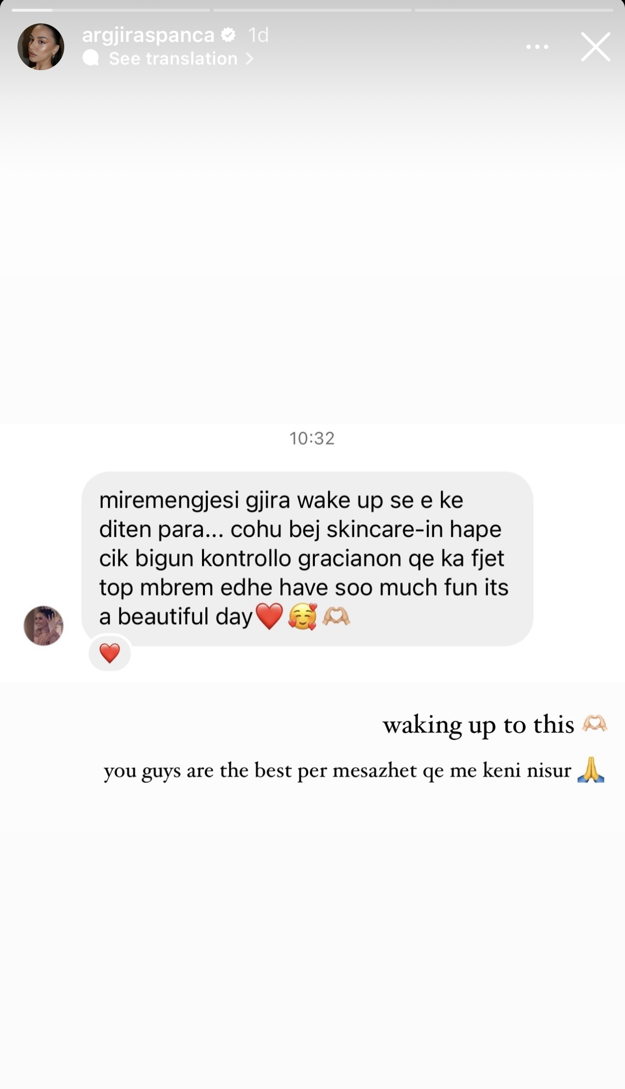 Argjira këtë mëngjes ka marrë një mesazh të pazakontë nga një ndjekëse e cila e ka kujtuar të bëjë ‘skin care’ për të nisur ditën dhe të kontrollojë Gracianon, që mesa duket e paska bërë gjumin ‘top’. Ky mesazh, siç shkruan ajo, ja ka bërë ditën më të mirë.