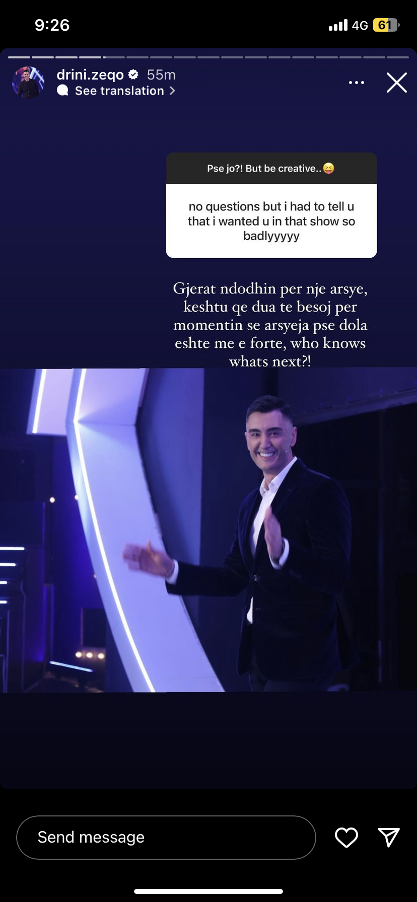 Ajo çfarë ka rënë në sy është një deklaratë e vogël e tij në Instastory që shkruan: Gjërat ndodhin për një arsye kështu që dua të besoj për momentin se arsyeja pse dola është më e fortë , who knows what’s next?( Kush e di çfarë vjen mbrapa)