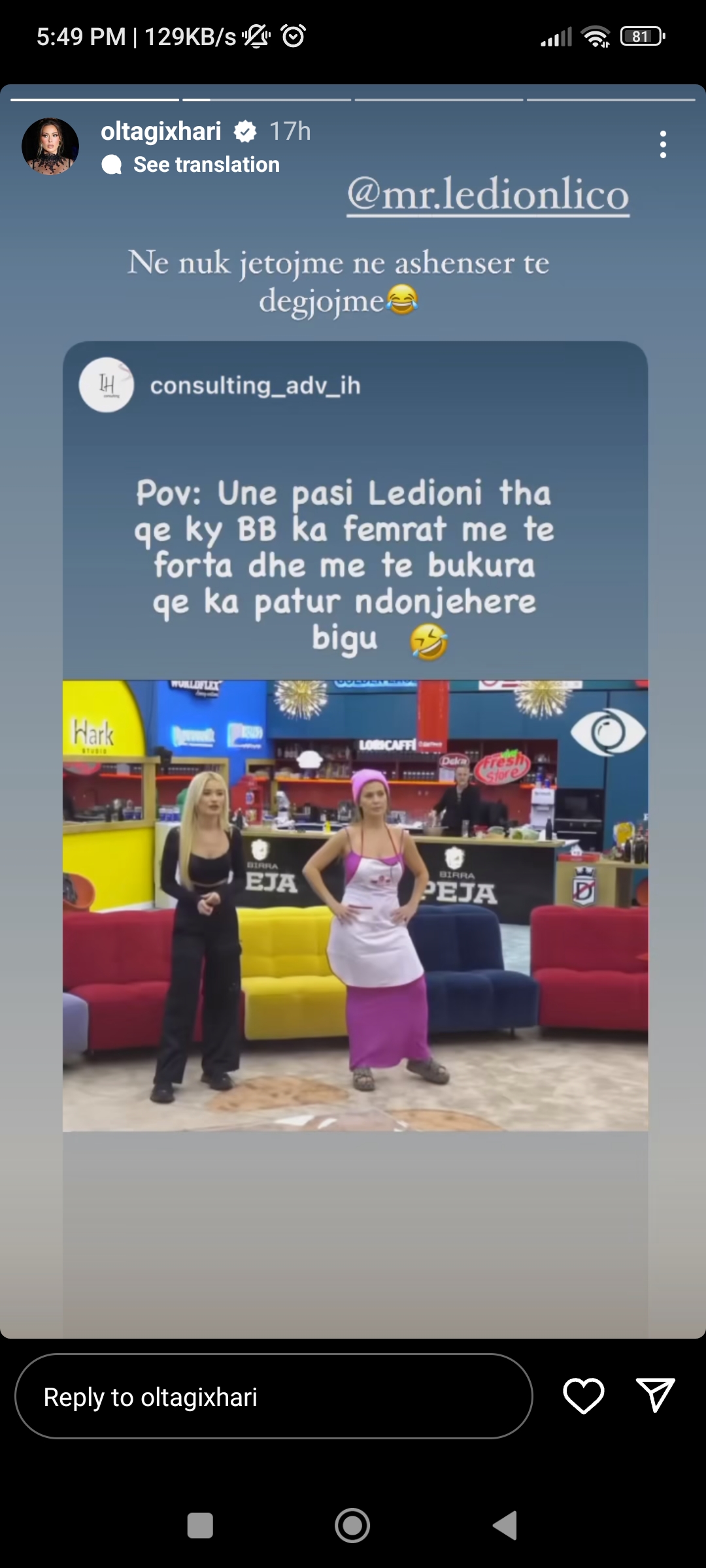 Aktorja ka ripostuar në InstaStory një foto të sajën ku shkruhet, “Unë pasi Ledioni tha që ky BB ka femrat më të forta dhe më të bukura që ka patur ndonjëherë bigu”, dhe ku shihet duke qëndruar në një pozicion “gjykues”.