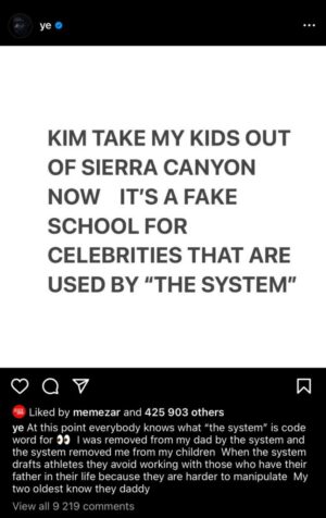 “Kim nxirr fëmijët e mi nga Sierra Canyon, tani është një shkollë e rreme për të famshmit që përdoren nga ‘sistemi’”, shkroi reperi me shkronja kapitale në Instagram të mërkurën mbrëma.