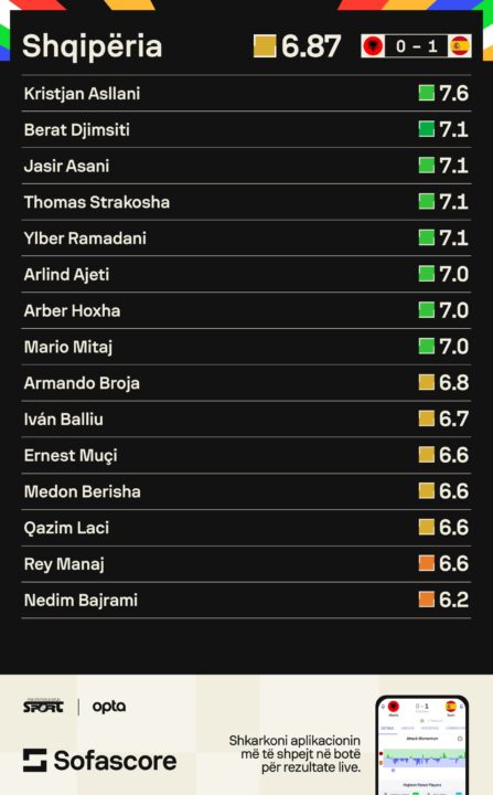 Notat e Kombëtares sipas “Sofa Score”, ky është futbollisti më i vlerësuar
