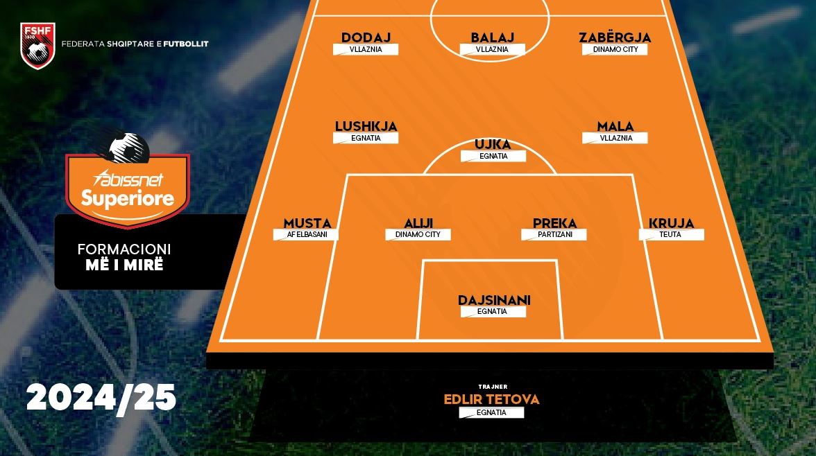 Trajnerët e ekipeve kombëtare të moshave kanë përzgjedhur formacionin më të mirë të sezonit 2024/2025 në kampionatin shqiptar “Abissnet Superiore”. Në top 11-shen e këtij sezoni dominojnë dy ekipet finaliste të “Final 4”, Egnatia dhe Vllaznia, që përfaqësohen me nga tre lojtarë secila.