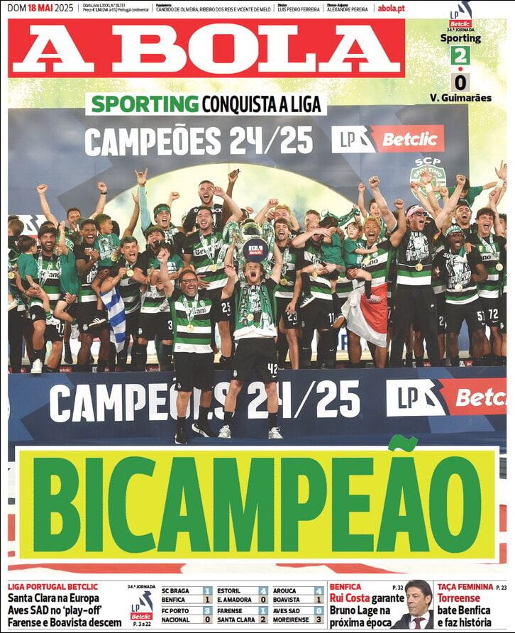 Luanët e Lisbonës gjithsesi nuk i lane asgjë rastësisë, teksa triumfuan 2-0 në Jose Alvalade ndaj Giumaraes duke siguruar titullin e 21 në histori e të dytin radhazi. Golat e fitores për vendasit u realizuan nga Concalves dhe Gyokeres, me sulmuesin suedez që e mbyll sezonin me plotë 39 gola e 8 asist, duke qenë njeriu lider për kampionët. Edhe e përditshmja portugeze A Bola hapet ditën e sotme me titullin BiCampeon, duke i dhënë vëmendjen kryesore përsëritjes së suksesit për të dytin vit radhazi.