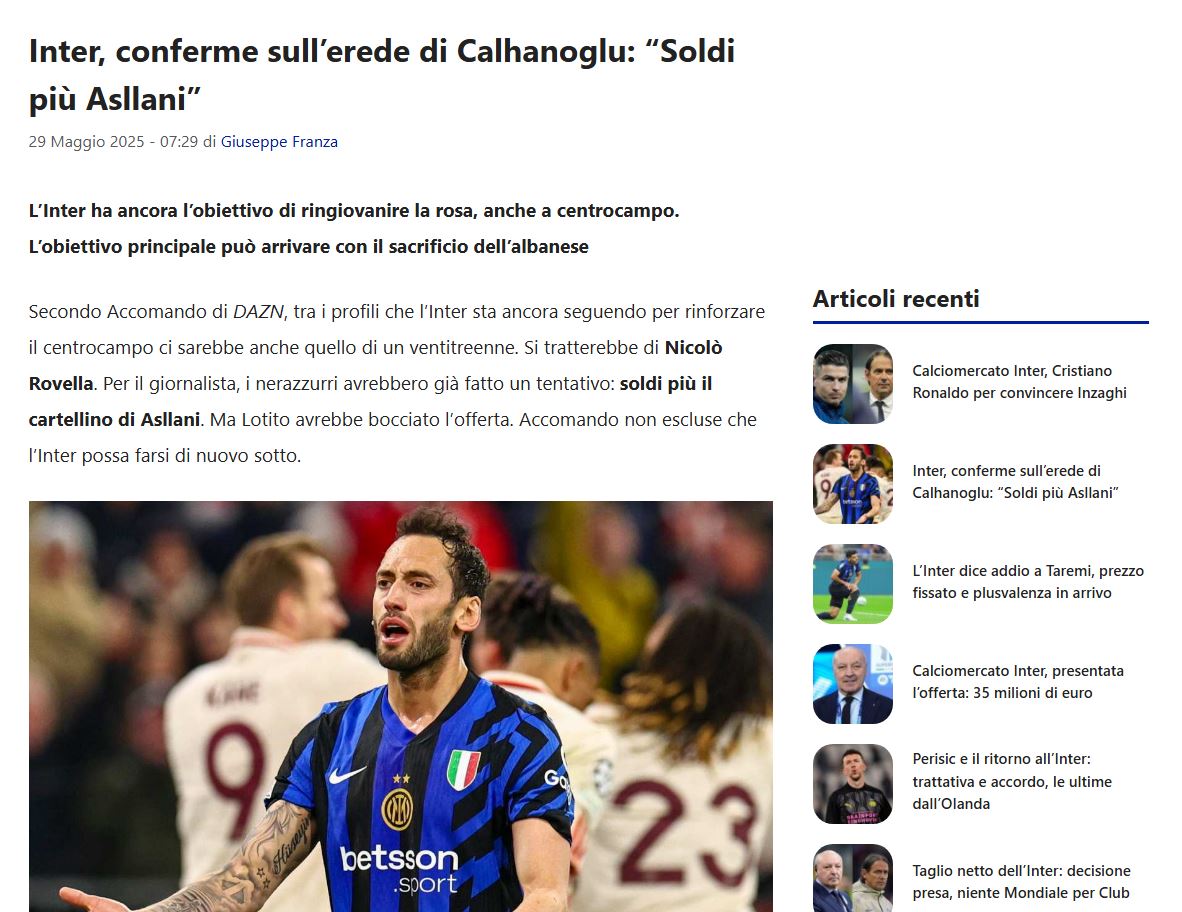 Në Itali, emri i Asllanit vijon të bëjë shumë “zhurmë”, kjo për vetë faktin se mediat e shohin mesfushori kuqezi gjithnjë e më larg Inter, më saktë e bëjnë të sigurt largimin e tij, edhe pse ka një kontratë të vlefshme deri në 2028. Ky ishte një sezon ndryshe për Asllanin, kishte më shumë minuta në dispozicion, por paraqitjet e tij nuk kanë bindur stafin zikaltër, me këta të fundit që po shohin në treg për të tjerë opsione, për të gjetur një zëvendës për Calhanoglu. Është e qartë që turku nuk preket, edhe pse edhe ky i fundit nuk ka qenë në nivelin që pritej. Calhanoglu mund të shitet vetëm nëse vjen një ofertë shumë e kënaqshme ekonomike.