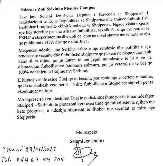 Selami Jenisheri është rikthyer me këshillat e tij për Kombëtaren e Shqipërisë. Këtë herë ish-deputeti i ka drejtuar një letër Silvinjos ku garanton fitoren ndaj Serbisë.