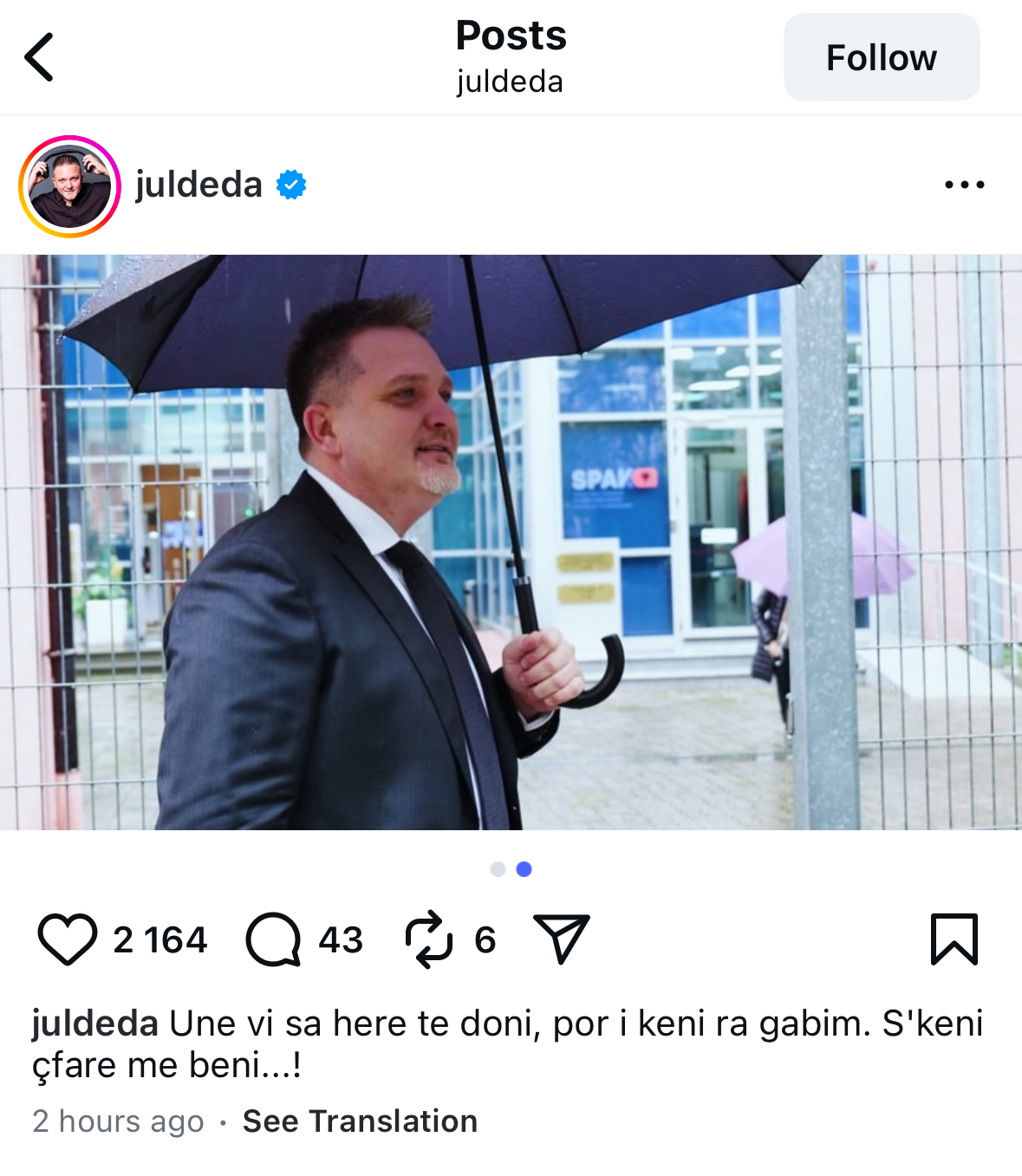 Në imazhet e postuara, Deda shfaqet pranë ambienteve të SPAK-ut, ndërsa krahas tyre ka lënë edhe një koment me tone sfiduese: “Unë vi sa herë të doni, por i keni rënë gabim. S’keni çfarë më bëni…!” Mesazhi i tij enigmë ka ngjallur reagime të shumta, si nga ndjekësit ashtu edhe nga figura të tjera publike, duke shtuar misterin rreth qëllimit të prezencës së tij aty.