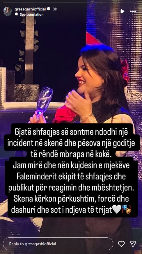 Gjatë interpretimit në skenë, aktorja ka pësuar një incident që i shkaktoi një goditje të fortë në pjesën e pasme të kokës. Vetë Gresa ka reaguar më pas në rrjetet sociale, ku ka ndarë një fotografi nga shfaqja dhe ka sqaruar çfarë ndodhi.