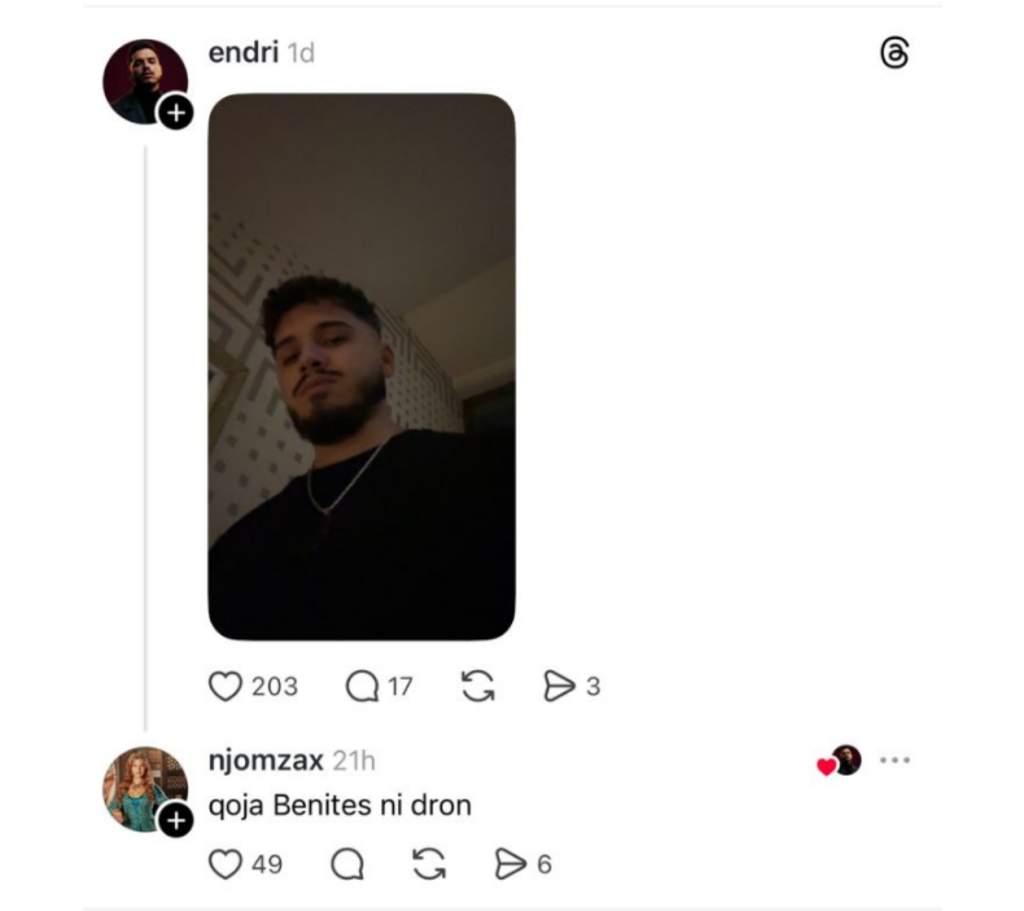 Endri ka zgjedhur një mënyrë diskrete, por shumë domethënëse për të reaguar: një “like” në rrjetet sociale. Komenti që mori miratimin e tij ishte i shkurtër, por mjaft i fortë emocionalisht: “Qoja Benitës nji dron” – një thirrje e fansave për një gjest romantik që do të trondiste qiellin e shtëpisë së BBVK.