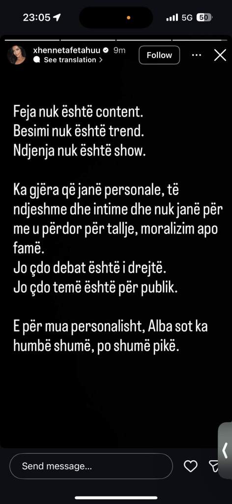 Në reagimin e saj, Xheneta thekson se besimi dhe feja nuk duhet të shndërrohen në mjet për debat televiziv apo për përfitim vëmendjeje. “Feja nuk është content. Besimi nuk është trend. Ndjenja nuk është show”, shprehet ajo, duke vënë theksin tek fakti se ka tema që, sipas saj, duhet të mbeten personale dhe të paprekshme nga spektakli.