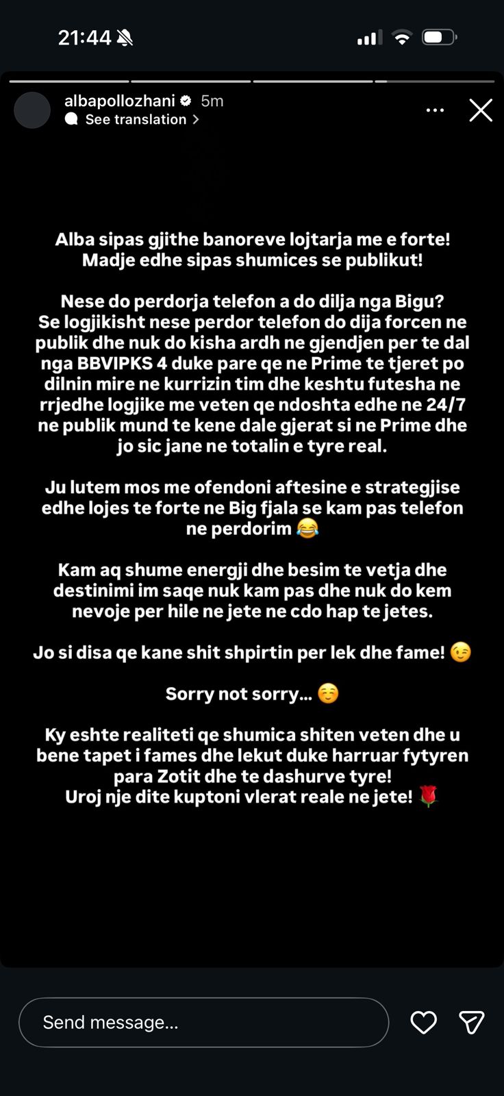 Ish-banorja ka shpërthyer në rrjetet sociale, ku i ka quajtur pretendimet për përdorim të telefonit brenda shtëpisë si thashetheme dashakeqe dhe fyerje të drejtpërdrejta ndaj inteligjencës, karakterit dhe strategjisë së saj të lojës. Sipas Albës, këto akuza nuk kanë asnjë bazë reale dhe po përdoren vetëm për të njollosur imazhin e saj pas përfundimit të eksperiencës në reality show.