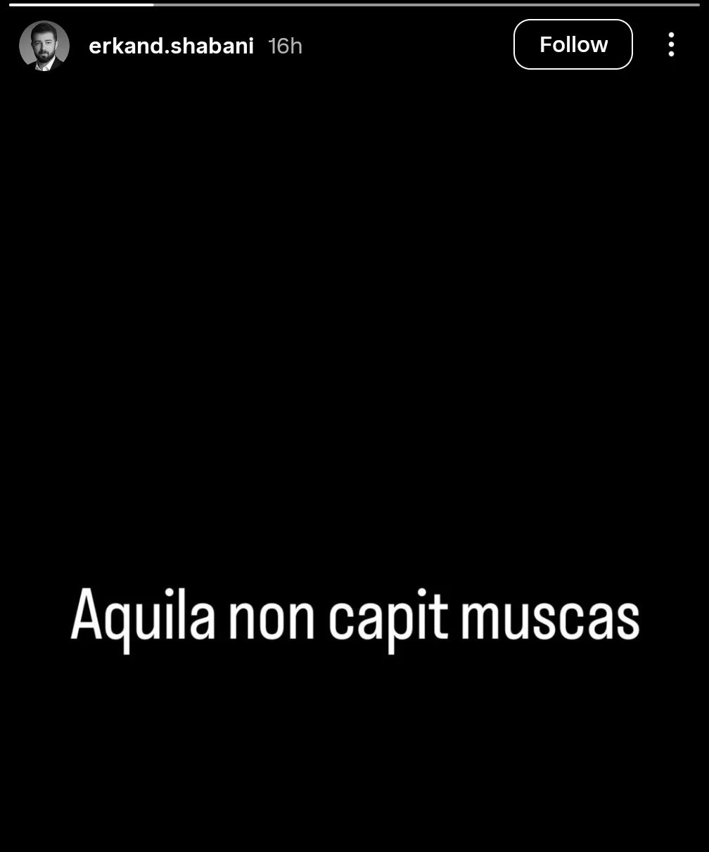 Në profilin e tij në Instagram Story, Shabani ka publikuar një shprehje latine mbi një sfond të zi, e cila duket se mbart një mesazh të fortë simbolik.