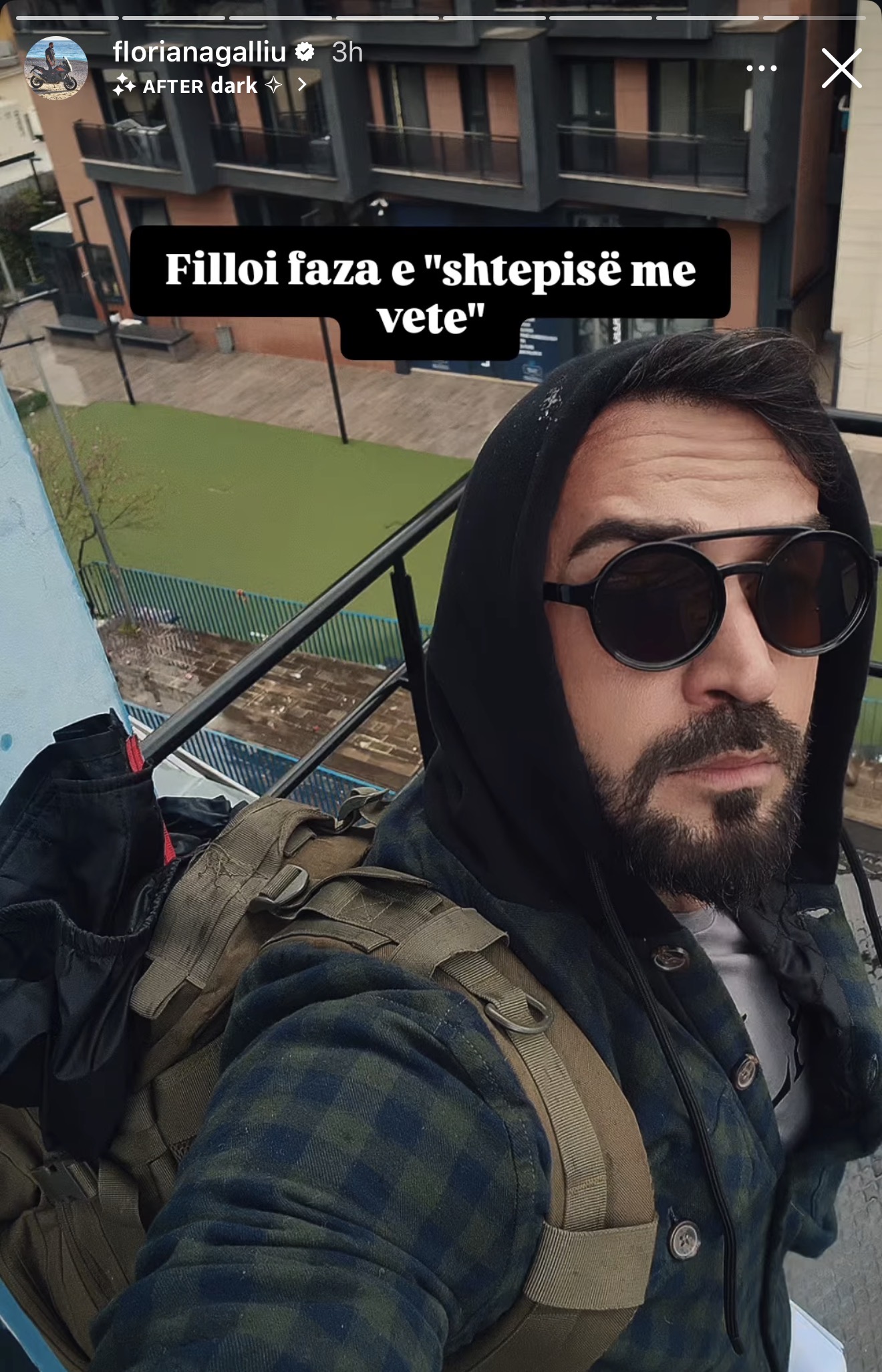 Në një foto të publikuar në InstaStory, Agalliu shfaqet i vetëm, i veshur me një xhaketë me kapuç dhe syze dielli, teksa qëndron në një ambient të jashtëm, në një ballkon me pamje nga një kompleks banimi. Në krah mban një çantë shpine, ndërsa pranë tij duket edhe një çadër, duke krijuar një atmosferë paksa të ftohtë dhe reflektuese.