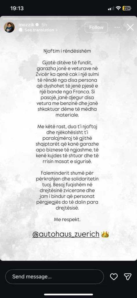 “Gjatë ditëve të fundit, garazha jonë e veturave në Zvicër ka qenë cak i një sulmi të rëndë nga disa persona që dyshohet të jenë pjesë e një bande nga Franca. Si pasojë, janë djegur disa vetura me benzinë dhe janë shkaktuar dëme të mëdha materiale.”
